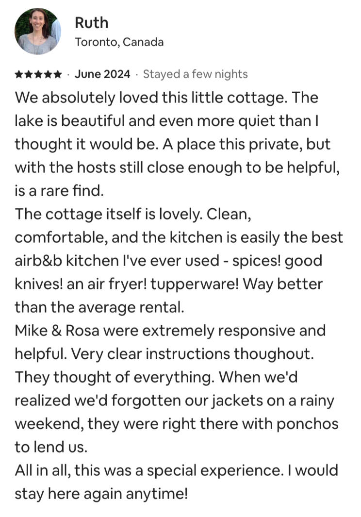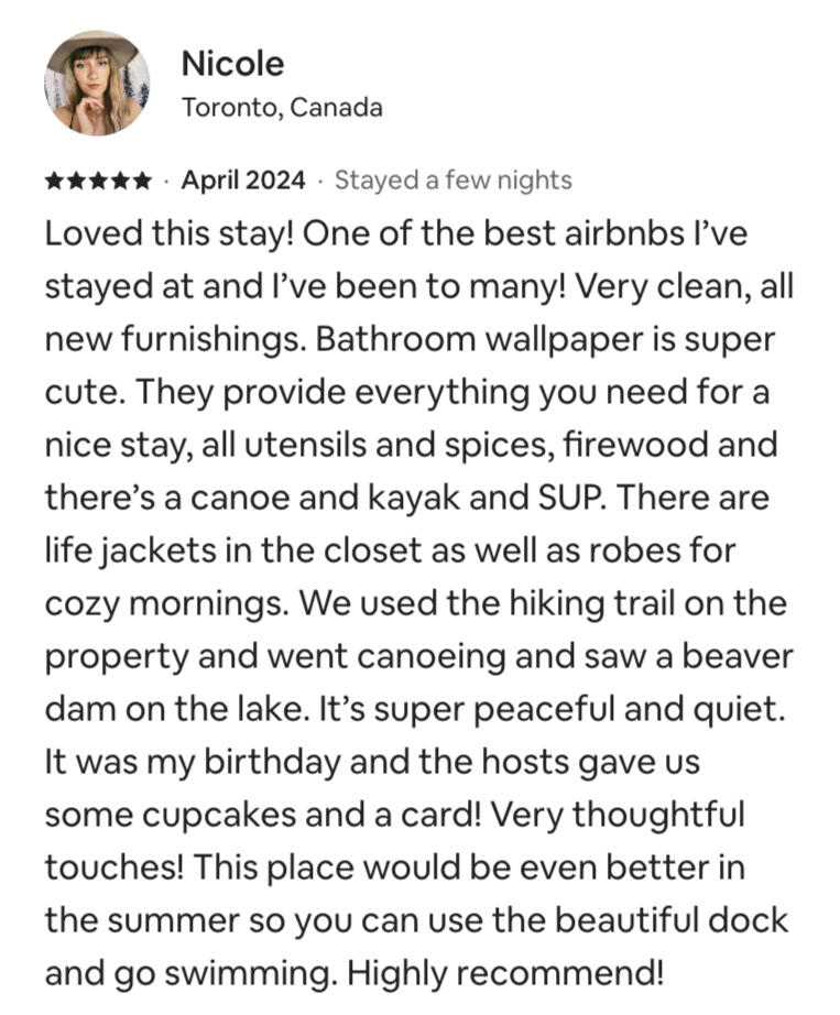 Canoeing, kayaking, watching our resident beavers and otters swimming by...We invite you to experience a true Canadian experience.If you're an avid hiker, you can go for a private hiking experience on our private trail (4-5km) and check out Silent Lake Provincial Park (20 min) or Algonquin (1 hour 15 min drive) to enjoy the beautiful Canadian nature.